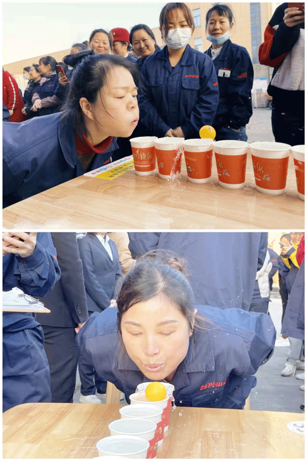 第一個(gè)游戲——“魚躍龍門”,共18名參賽選手,分3組,每組6人,每人面前有6個(gè)裝滿水的水杯,第1個(gè)水杯里放置乒乓球1枚,參賽者要用嘴巴吹氣,將乒乓球從第1個(gè)杯子吹到第6個(gè)杯子,并且要一個(gè)接一個(gè)地吹至下一個(gè)杯子內(nèi),直到吹入最后一個(gè)杯子,最后計(jì)算總成績(jī),以用時(shí)最少的為勝。裁判長(zhǎng)發(fā)令槍聲一響,所有人員都嚴(yán)格按照規(guī)則,氣運(yùn)丹田,卯足干勁,細(xì)心地、嚴(yán)謹(jǐn)?shù)?、精?zhǔn)地吹動(dòng)乒乓球。游戲中,有不滿20歲的小姑娘,也有年近退休的老大姐,大家都積極踴躍地參與。有的選手費(fèi)了九牛二虎之力將乒乓球吹到第五個(gè)水杯時(shí),卻不慎將球吹出了杯子,結(jié)果按照規(guī)則,必須重新開始。她們有懊惱跺腳的,也有開心鼓掌的,旁邊的觀眾也是群情高昂,吶喊聲、加油聲、歡笑聲不絕于耳,一開始就將整個(gè)活動(dòng)推向了高潮。