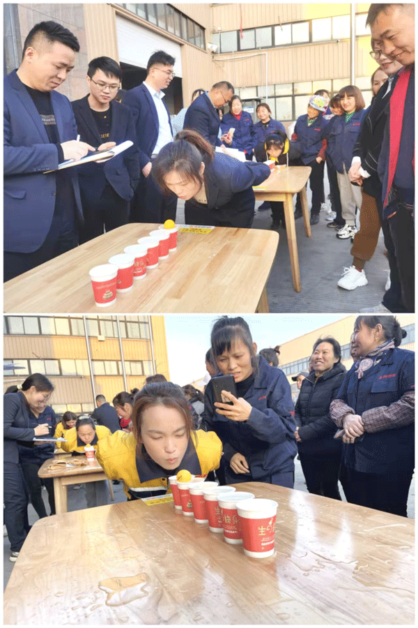 第一個(gè)游戲——“魚躍龍門”,共18名參賽選手,分3組,每組6人,每人面前有6個(gè)裝滿水的水杯,第1個(gè)水杯里放置乒乓球1枚,參賽者要用嘴巴吹氣,將乒乓球從第1個(gè)杯子吹到第6個(gè)杯子,并且要一個(gè)接一個(gè)地吹至下一個(gè)杯子內(nèi),直到吹入最后一個(gè)杯子,最后計(jì)算總成績(jī),以用時(shí)最少的為勝。裁判長(zhǎng)發(fā)令槍聲一響,所有人員都嚴(yán)格按照規(guī)則,氣運(yùn)丹田,卯足干勁,細(xì)心地、嚴(yán)謹(jǐn)?shù)?、精?zhǔn)地吹動(dòng)乒乓球。游戲中,有不滿20歲的小姑娘,也有年近退休的老大姐,大家都積極踴躍地參與。有的選手費(fèi)了九牛二虎之力將乒乓球吹到第五個(gè)水杯時(shí),卻不慎將球吹出了杯子,結(jié)果按照規(guī)則,必須重新開始。她們有懊惱跺腳的,也有開心鼓掌的,旁邊的觀眾也是群情高昂,吶喊聲、加油聲、歡笑聲不絕于耳,一開始就將整個(gè)活動(dòng)推向了高潮。