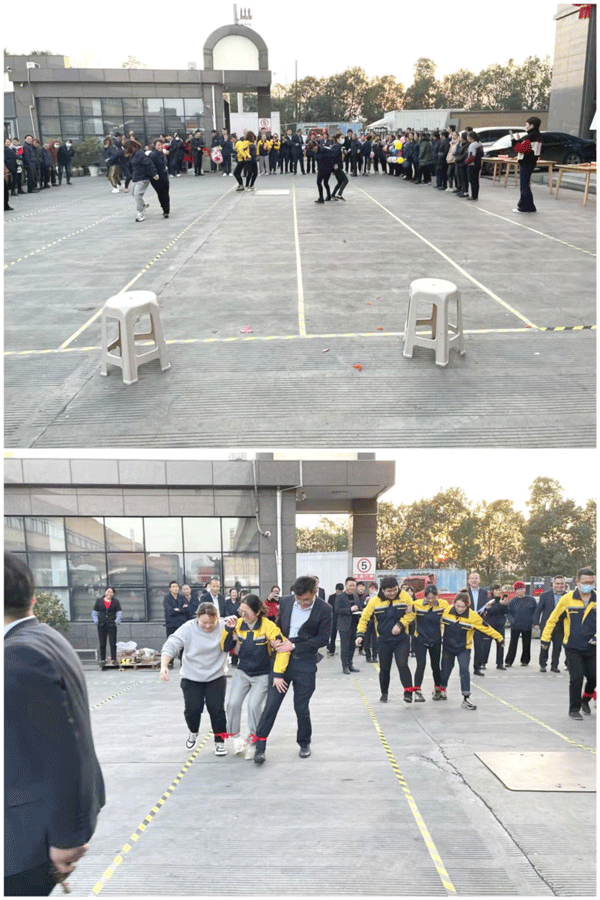 第二個(gè)游戲——“三人四足”,共60名參賽選手,3人組隊(duì),每隊(duì)站成一排,中間選手的左右腳與兩邊選手的右左腳用綁帶綁在一起(踝關(guān)節(jié)處),每隊(duì)選手在自己的跑道上集體前進(jìn),往返一趟,最后計(jì)算出所有參賽成績(jī)。60名選手,分別來(lái)自新廠、老廠、第二事業(yè)部的各個(gè)部門,女職工們還特邀“男伴”助陣?;顒?dòng)中,選手們精心準(zhǔn)備,從系綁帶,到排練、到找節(jié)奏,好不熱鬧。當(dāng)裁判長(zhǎng)發(fā)令槍響起后,各隊(duì)選手邁著鏗鏘的步伐,在各自的節(jié)奏口令里,緊張有序地前行。有快速通過的,有慢而整齊的,也有不慎摔倒的,旁邊還有被現(xiàn)場(chǎng)氛圍感染的觀眾們。
